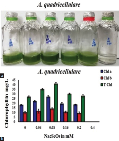 ![]() | Figure 5: Effect of Na2S2O5 on growth (a) and chlorophyll accumulation and (b) in Asterarcys quadricellulare (Chl a-chlorophyll a, Chl b-chlorophyll b, and T Chl-Total chlorophylls). [Click here to view] |