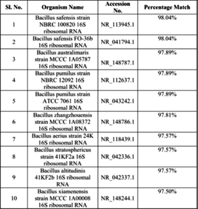 The selected bacterial isolate (KKSC12) was identified morphologically by Gram staining and genetically by 16S rRNA sequencing. The molecular identification (16S rRNA sequencing) was performed at Biokart PVT Ltd. Bangalore.