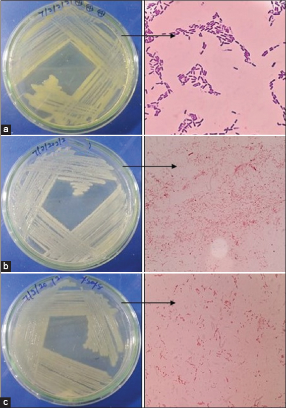 | Figure 1: Pure culture of endophytic bacterial isolates with morphological structure (a) Bacillus cereus (EMS1 and EMS4), (b) Enterobacter cloacae (EMS13, EMS14, and EMS16), (c) Enterobacter hormaechei (EMS18). [Click here to view] |