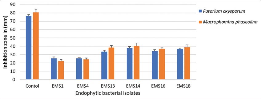 Endophytic bacterial isolates were examined for the inhibitory impact on the isolates shown in Figure 2. In antagonistic activity against fungal pathogens such as F. oxysporum (7693) and M. phaseolina (6630), the bacterial isolates exhibited significant antagonism. The results indicate that EMS1 and EMS4 inhibited pathogenic growth significantly, with a mean inhibition diameter of 25 ± 0.02 mm and 24 ± 0.08 mm, inhibit F. oxysporum with other strains, such as EMS13 (28 ± 0.1 mm), EMS14 (23 ± 0.2 mm), EMS16 (32 ± 0.01 mm), and EMS18 (32 ± 0.1 mm) and of 25 ± 0.02 mm and 24 ± 0.08 mm, similarly against M. phaseolina EMS1 and EMS4 showing 22 ± 0.01and 21 ± 0.02 and other strains such as EMS13 (30 ± 0.1 mm), EMS14 (29 ± 0.2 mm), EMS16 (28 ± 0.01 mm), and EMS18 (28 ± 0.1 mm).