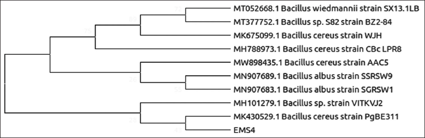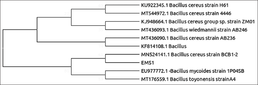 | Figure 3: Phylogenetic relationship of isolate EMS1 with the analyzed sequences by maximum likelihood method based on 16S rRNA gene sequences. [Click here to view] |