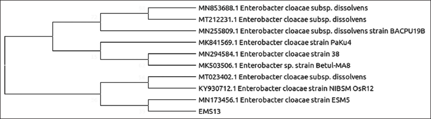 | Figure 5: Phylogenetic relationship of isolate EMS13 with the analyzed sequences by maximum likelihood method based on 16S rRNA gene sequences. [Click here to view] |