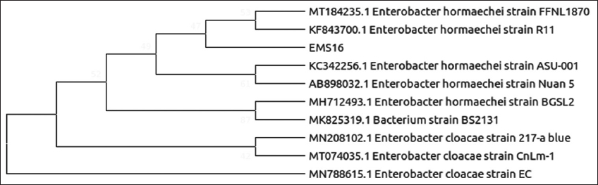 | Figure 7: Phylogenetic relationship of isolate EMS16 with the analyzed sequences by maximum likelihood method based on 16S rRNA gene sequences. [Click here to view] |