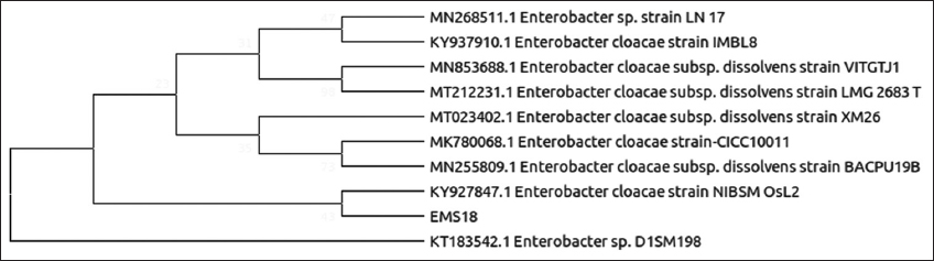 | Figure 8: Phylogenetic relationship of isolate EMS18 with the analyzed sequences by maximum likelihood method based on 16S rRNA gene sequences. [Click here to view] |