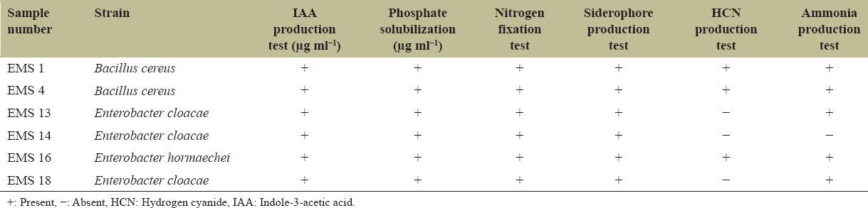 +: Present, −: Absent, HCN: Hydrogen cyanide, IAA: Indole-3-acetic acid.