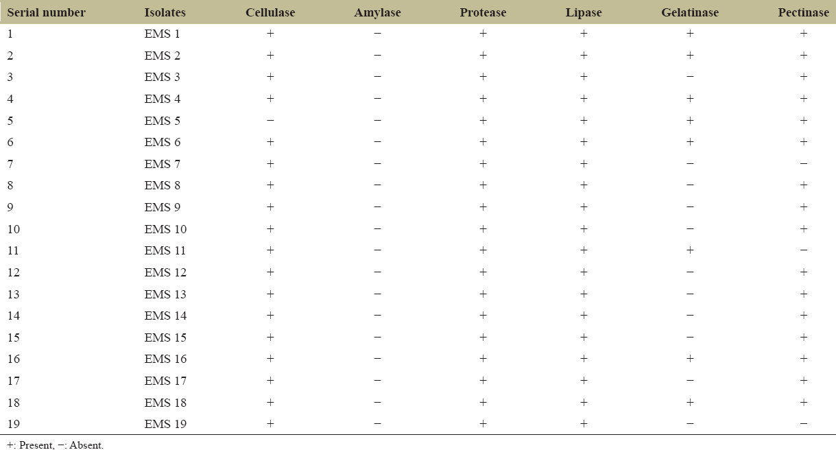 | Serial number | Isolates | Cellulase | Amylase | Protease | Lipase | Gelatinase | Pectinase |