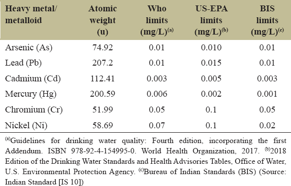| Heavy metal/metalloid | Atomic weight (u) | Who limits (mg/L)( | US-EPA limits (mg/L)( | BIS limits (mg/L)( |
