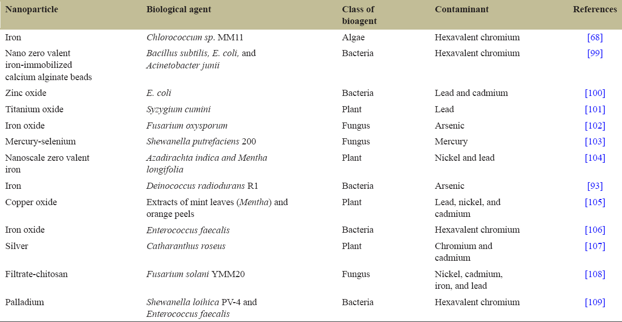 Irrespective of various advantages of bioremediation such as high specificity and selectivity, economic feasibility, and environment friendly nature, these processes have several drawbacks as well. Ample of time is needed for the degradation of toxic compound to be carried out and the use of bioremediation at extremely contaminated sites becomes restricted. The in situ bioremediation poses problems such as seasonal difference in microbial activity, problems with the use of additives for the purpose of treatment, and sometimes, the process get out of control and becomes difficult to manage. Furthermore, the ex situ method is inefficient for the remediation of heavy metals and chlorinated hydrocarbons. This necessitates the need for applying nanotechnology to bioremediation in order to remediate contaminated sites [29,30]. By integrating nanotechnology with bioremediation, excellent and extraordinary adsorption capacities can be achieved due to the surface effect, small size effect, quantum effect, as well as macroquantum surface effect.