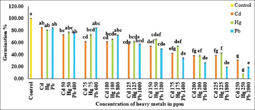 | Figure 1: Lethal dose of Cd, Hg, and Pb on seed germination of Mucuna pruriens (L.) DC. Data represent mean values ± SE of three replicates; each experiment was repeated thrice. Means with common letters are not significantly different at P ≤ 0.05 according to Duncan’s multiple range test (DMRT). Cd: Cadmium, Hg: Mercury, Pb: Lead. [Click here to view] |