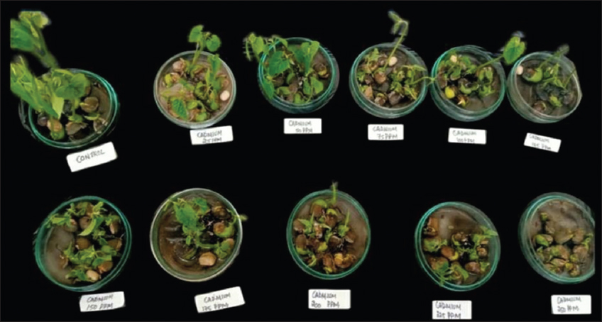 | Figure 2: Germination of Mucuna pruriens (L.) DC seeds treated with different concentration of heavy metals (Cd, Hg and Pb). Cd: Cadmium, Hg: Mercury, Pb: Lead. [Click here to view] |
