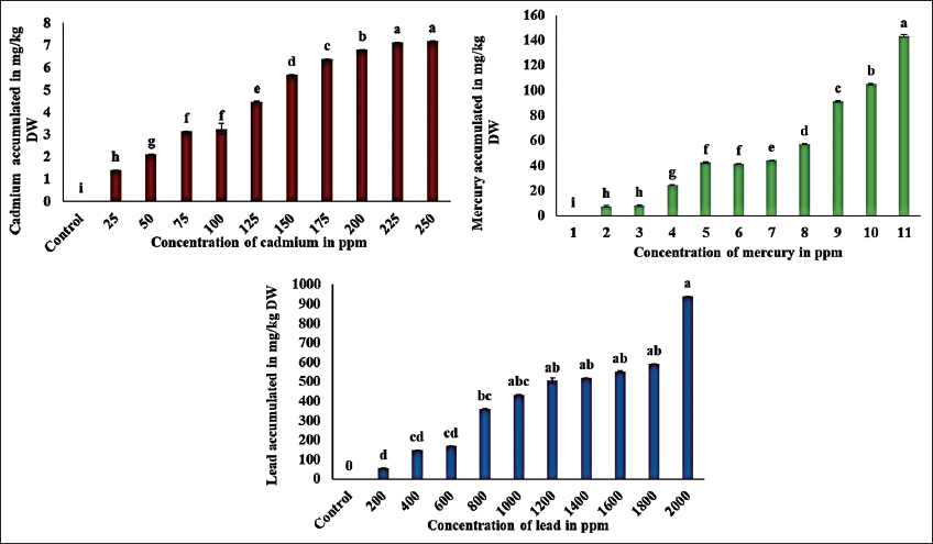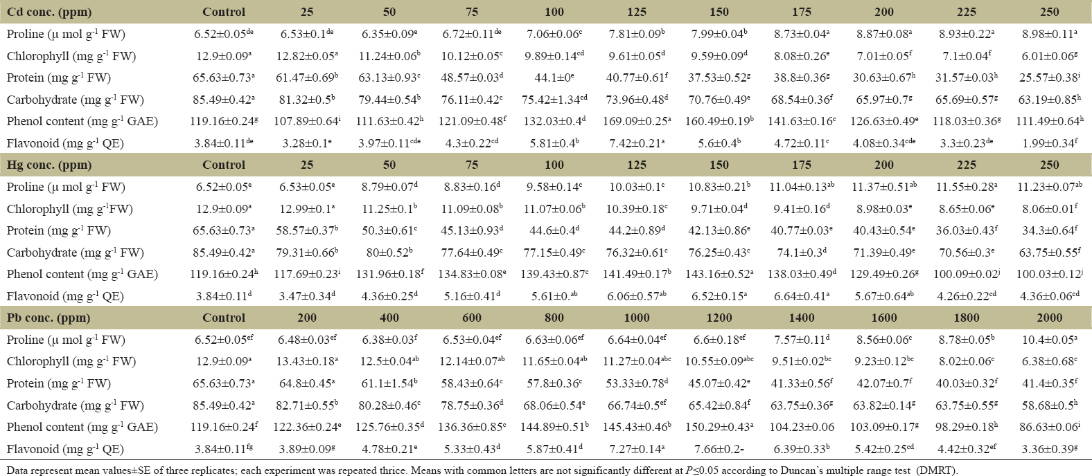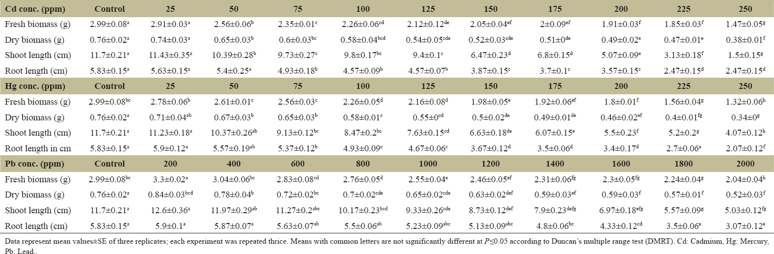 Data represent mean values±SE of three replicates; each experiment was repeated thrice. Means with common letters are not significantly different at P≤0.05 according to Duncan’s multiple range test (DMRT). Cd: Cadmium, Hg: Mercury, Pb: Lead..