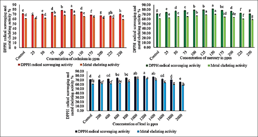 | Figure 3: DPPH radical scavenging activity and metal chelating activity of heavy metal (Cd, Hg, and Pb) treated seedlings of Mucuna pruriens (L.) DC. Data represent mean values ± SE of three replicates; each experiment was repeated thrice. Means with common letters are not significantly different at P ≤ 0.05 according to Duncan’s multiple range test (DMRT). Cd: Cadmium, Hg: Mercury, Pb: Lead. [Click here to view] |
