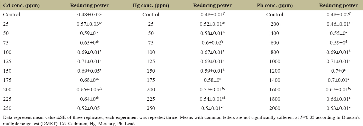 | Cd conc. (ppm) | Reducing power | Hg conc. (ppm) | Reducing power | Pb conc. (ppm) | Reducing power |