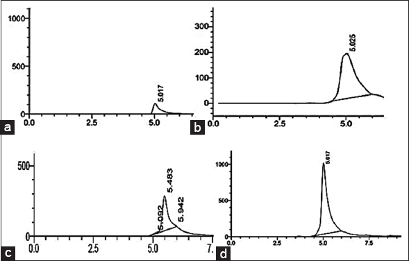 | Figure 5: HPLC chromatogram for (a) Standard, (b) Control, (c and d) - 25 ppm and 125 ppm Cd treated seedlings of Mucuna pruriens (L.) DC. Cd: Cadmium. [Click here to view] |