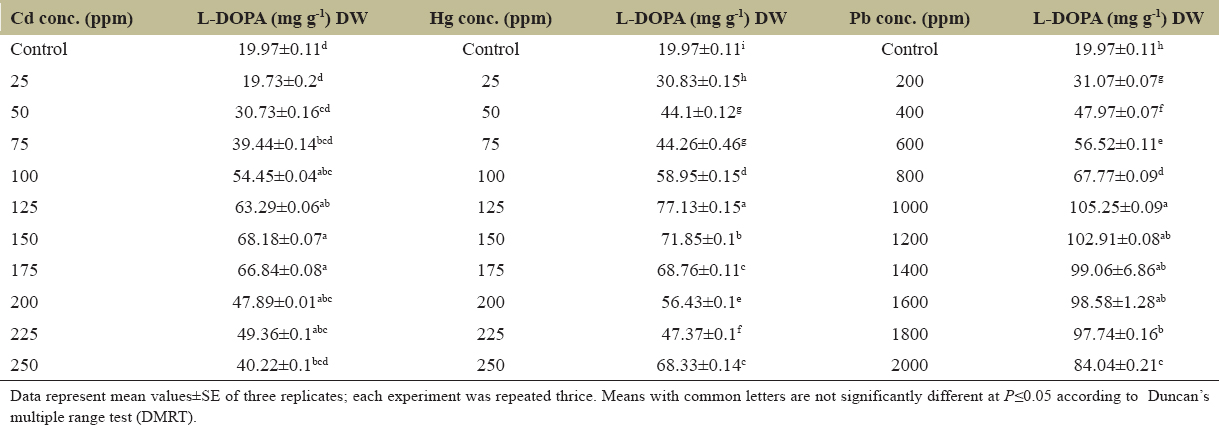 The stress induced by heavy metals may affect the efficacy and quality of the biosynthesis of secondary metabolites in medicinal plants. The mobile heavy metals are known to suppress the secondary metabolites production in some species by inactivating genes of enzymes involved in the biosynthetic pathway or enhancing the secondary metabolite production in some other species by activating the gene expression involved in the biosynthesis [9,10]. The present study investigates the effects of Cd, Hg, and Pb on the germination, growth, and biochemical characteristics of M. pruriens. Furthermore, the present work aspires to study the impact of the selected heavy metals on the L-DOPA content.