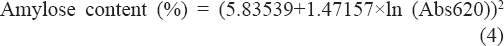 Amylose content of samples will be determined by spectrophotometer at wavelength 620 nm [20]. The best linear model selected was expressed by Eq. 4 (R2 = 96%).