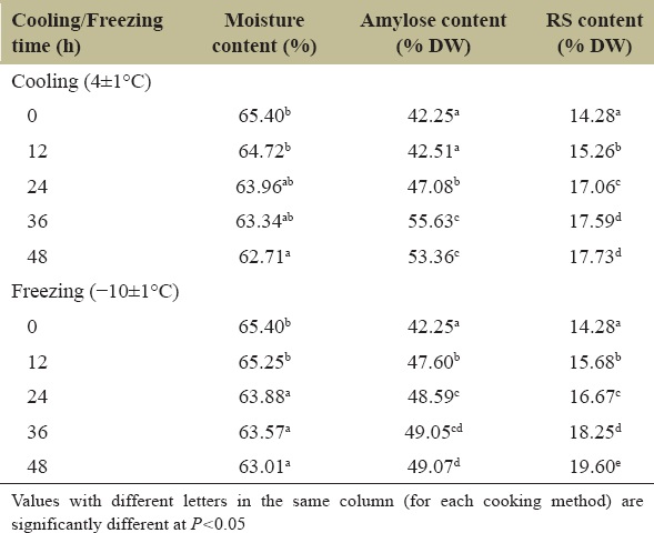 The obtained results shown that cooking conditions have the potential of decreasing and increasing the amount of RS [Table 3].