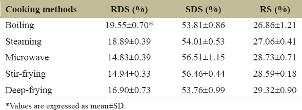 | Cooking methods | RDS (%) | SDS (%) | RS (%) |