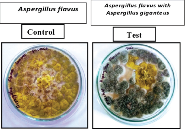 A dual culture system is an effective test to identify the interactions of antagonistic fungi with pathogenic fungi. 5 mm diameter of actively grown mycelia from antagonistic fungi A. giganteus and pathogenic fungi A. flavus were inoculated on Petri plates containing czapek yeast extract agar. Both agonist and pathogenic fungi grow in opposite directions at equal distances from each other. The mycelia from pathogenic fungi inoculated in the plate in the absence of A. giganteus was used as a control. Then, the plates were incubated at 28°C for 4–6 days. The percentage of radial inhibition was calculated.