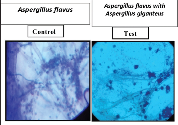 From the results, the inhibition of A. flavus by A. giganteus was found to be 84% in dual culture assay. The growth of A. flavus was arrested by the antifungal compounds released by A. giganteus. The inhibitory effect of A. giganteus on A. flavus is shown in Figure 1. Further, the hindrance intervened by A. giganteus was analyzed infinitesimally with lactophenol cotton blue staining. A. flavus developed within the nearness of A. giganteus appeared diminished hyphal stretching when compared with the control which shown a much more amplified mycelium. In addition, the tips of the hyphae showed up swollen proposing that the extremity of the hyphal tip was influenced by A. giganteus the inhibition mediated by A. giganteus was analyzed microscopically with lactophenol cotton blue staining. A. flavus grown in the presence of A. giganteus showed reduced hyphal elongation when compared with the control which displayed a much more extended mycelium. Moreover, the tips of the hyphae appeared swollen suggesting that the polarity of the hyphal tip was affected by A. giganteus, as shown in Figure 2.