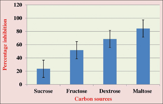 The medium-independent antagonism was determined with different carbon sources such as sucrose, fructose, maltose, and dextrose. Among the various sources used, dextrose as a carbon source used in czapek media showed a higher degree of inhibition and the results are shown in Figure 3.
