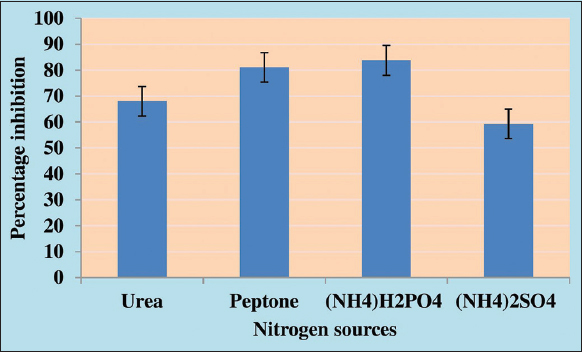 The antagonist activity of A. giganteus was elevated and attained its maximum inhibition in the czapek medium with dextrose as carbon sources, compared to sucrose, fructose, maltose, and dextrose incorporated czapek media was chosen for further studies. In the co-culture assay carried out with the different nitrogen sources, the impact of antifungal metabolite on the growth arrestment of pathogenic fungi was considerably high in the czapek medium with ammonium dihydrogen phosphate as the nitrogen source [Figure 4].