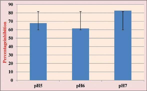 | Figure 5: Percentage inhibition of Aspergillus flavus during co-culture with Aspergillus giganteus in czapek medium with different pH. [Click here to view] |