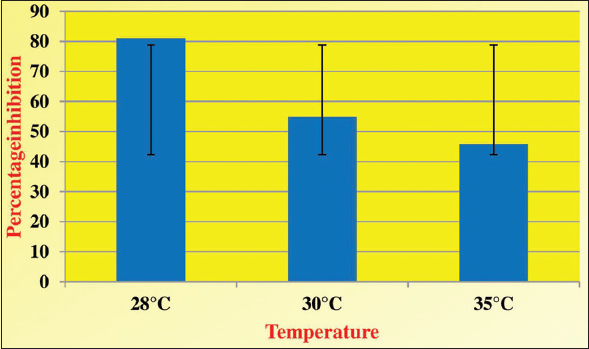 | Figure 6: Percentage inhibition of Aspergillus giganteus on Aspergillus flavus during culture in different temperature. In czapek medium with different temperature, the antagonistic effect of Aspergillus giganteus was found to be significant in the plate incubated at 28°C. It is depicted that the antagonistic effect is higher at 28°C compared to that of the other two temperature conditions 30°C and 35°C. [Click here to view] |