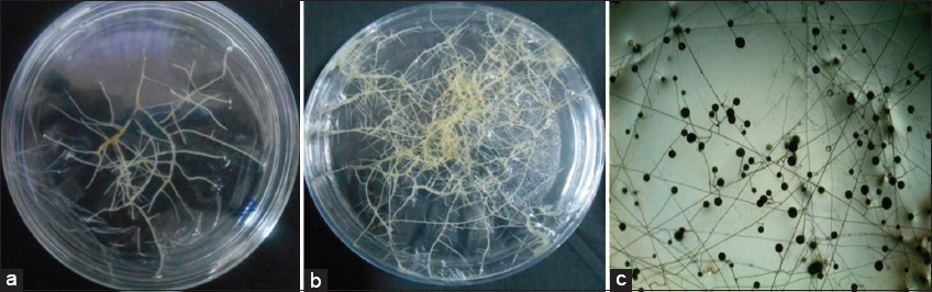 | Plate 1: Growth of transformed roots and multiplication of Glomus intraradices spores. (a and b) Growth of transformed roots and (c) multiplication of Gi spores interlinked with extramycelial network. [Click here to view] |