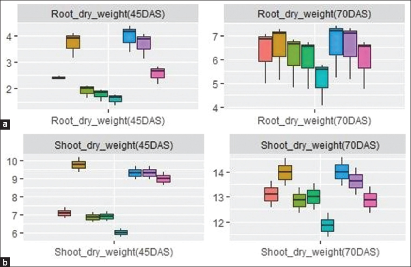 The roots were removed from soil in the pots and the adhering soil was washed and cleaned with water. The roots were shade dried for 15 min to remove water. Plant samples were air-dried at sampling periods 45 and 70 DAS and then kept in an oven at 60–70°C until a constant weight was obtained. The weight of the dried root and shoot samples was recorded and expressed as g plant-1.