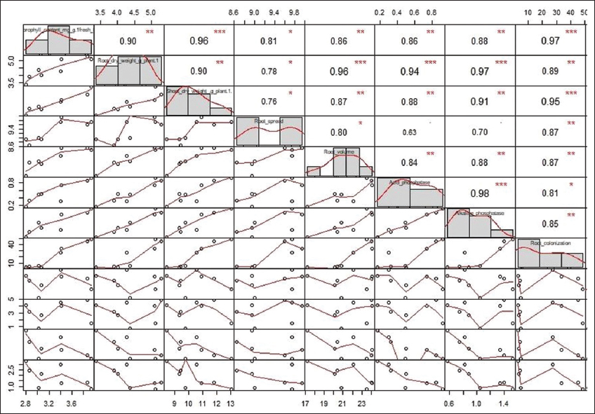 Similarly, the root length was increased at 6.14–22.20% level over non-mycorrhizal Cd applied plants under mycorrhizal inoculation with different levels of Cd. During 40 and 70 DAS, the mean chlorophyll content was the highest in AM inoculated control, followed by mycorrhizal inoculated treatments T6, T7, and T8, with the possibility of reaching the maximum of the high mean level. All uninoculated treatments (T1, T3, T4, and T5) showed poor chlorophyll content with a possibility of reaching a much lower level than the uninoculated control [Figure 3]. The effect of a good AM infectivity potential on reducing the toxic effect of Cd in polluted soil needs to be essentially studied and the present study has served this purpose. Heavy metal stress affects plant growth, but the inoculation of AM fungi in Cd contaminated soil decreases the reduction of overall plant growth in the present investigation, showing an increase in root and shoot length as well as dry weight at both stages of observation, as presented in Figure 1. The reduction observed at all levels of artificial Cd contamination, irrespective of the comparison between mycorrhizal inoculation and the inoculated control (T2), is possibly due to the reduction in the profuse hyphal elongation and branching, which ultimately causes a decrease in prime nutrient uptake like phosphorus. The principal component analysis (PCA) biplot in Figure 4 depicts the positive Eigen vector values for alkaline and acid phosphatase and other parameters such as plant biomass production, root spread and root volume, root colonization potential, and chlorophyll content. This proves the massive sporulation and the growth of Gi in soil has a great impact on the growth of plant. This is well supported by a study on mycorrhiza-Cd interaction on plant growth, nutrients and Cd accumulation, and AMF root colonization [27]. The researchers posited that mycorrhiza promotes plant growth whereas Cd addition reduces plant biomass production. The PCA biplot [Figure 4] implies positive correlation among the variables, such as total chlorophyll content and root colonization, suggesting minimum variation among them. In addition, the correlogram [Figure 5] shows a highly significant positive correlation (0.97***) among the same variables.