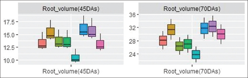 | Figure 6: Box and whisker plot showing maize root volume in mycorrhiza inoculated and uninoculated treatments at different levels of Cd. Box and whisker plots represent minimum, lower quartile, median, upper quartile, and maximum values. [Click here to view] |