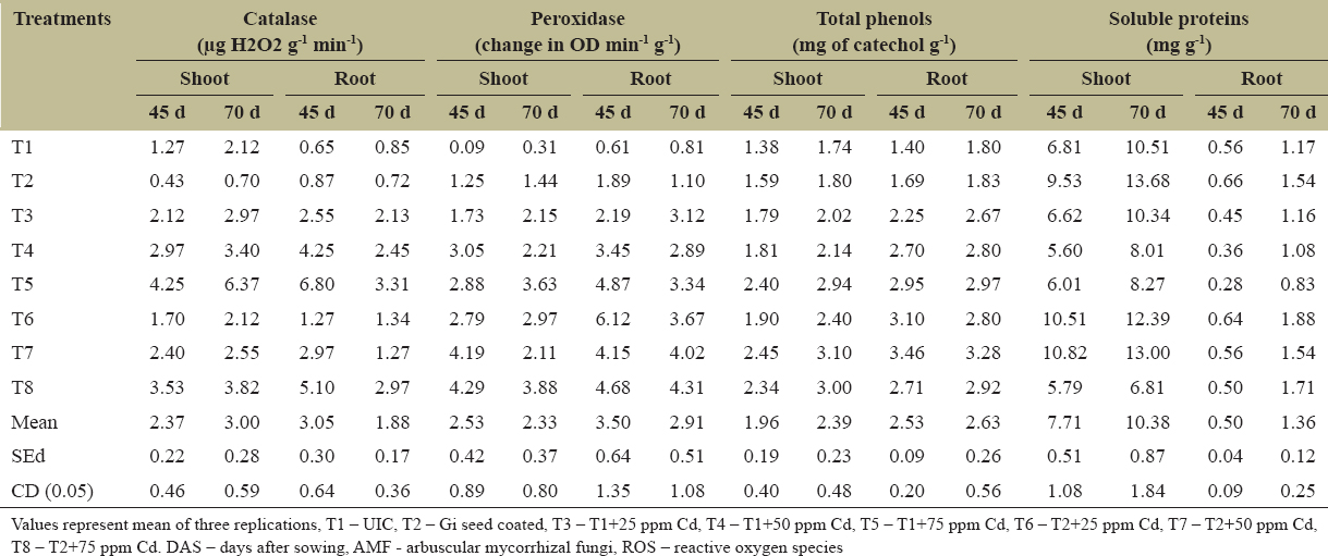 The production of ROS was significantly less in all uninoculated and inoculated controls (T1 and T2) without Cd spiking. However, H2O2 production was high at 75 ppm Cd (T5) level in roots (6.80 µg H2O2 g-1 min-1) and shoots (6.377 µg H2O2 g-1 min-1) during 45 DAS and 70 DAS, respectively. However, treatments inoculated with mycorrhiza showed a relative decrease in ROS, thus confirming the increased catalase activity [Table 1]. A relative increase in the peroxidase activity with increasing Cd levels due to AM inoculation was observed in both roots and shoots with maximum in roots (6.12 change in OD min-1 g-1).