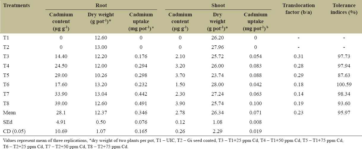 dry weight of two plants per pot, T1 – UIC, T2 – Gi seed coated, T3 – T1+25 ppm Cd, T4 – T1+50 ppm Cd, T5 – T1+75 ppm Cd,