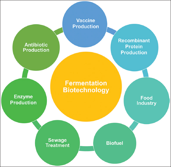 Fermentation biotechnology is a sustainable and rapidly growing field with an expectation to reach $205,465 million by 2023 [6], deals with reduced energy consumption, greenhouse gas emission, and recyclable waste generation for the production of value-added chemicals. Based on the type of production, fermentation biotechnology has vast scopes for various industries [Figure 2] as discussed below.