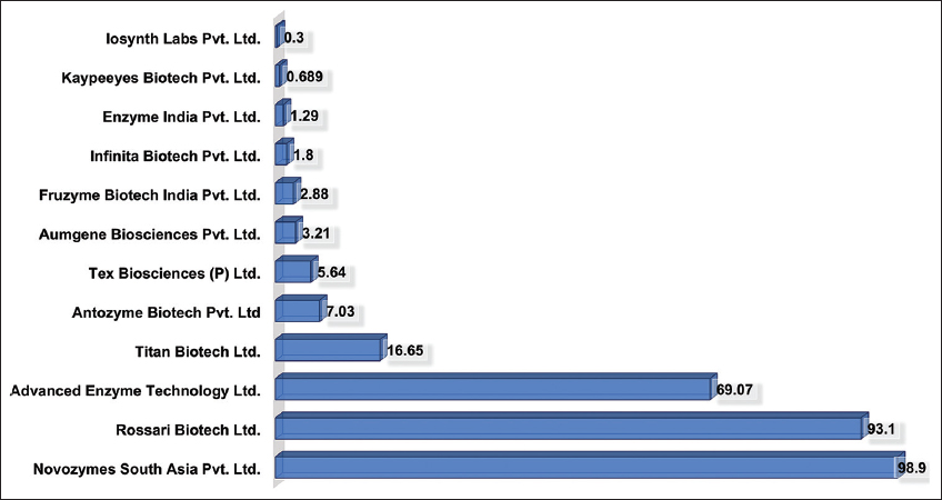 | Figure 6: Revenue generated by Indian industrial enzyme companies in 2020–2021 (in USD million). [Click here to view] |