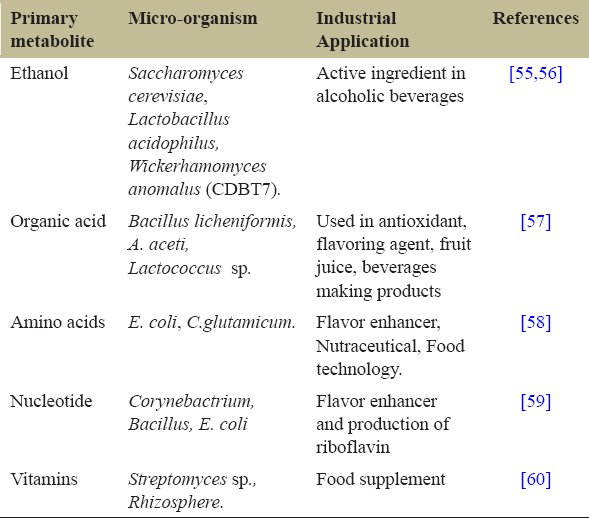 | Primary metabolite | Micro-organism | Industrial Application | References |