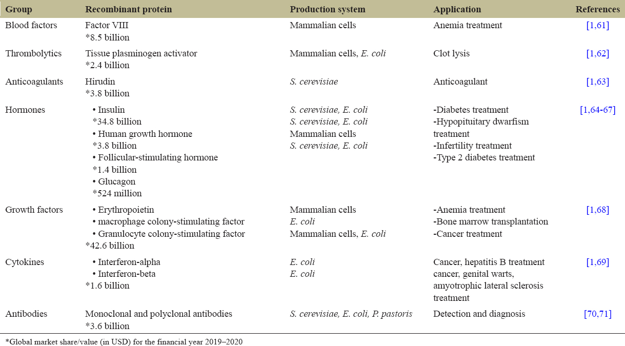 Table 2: Major groups of recombinant proteins developed and application.