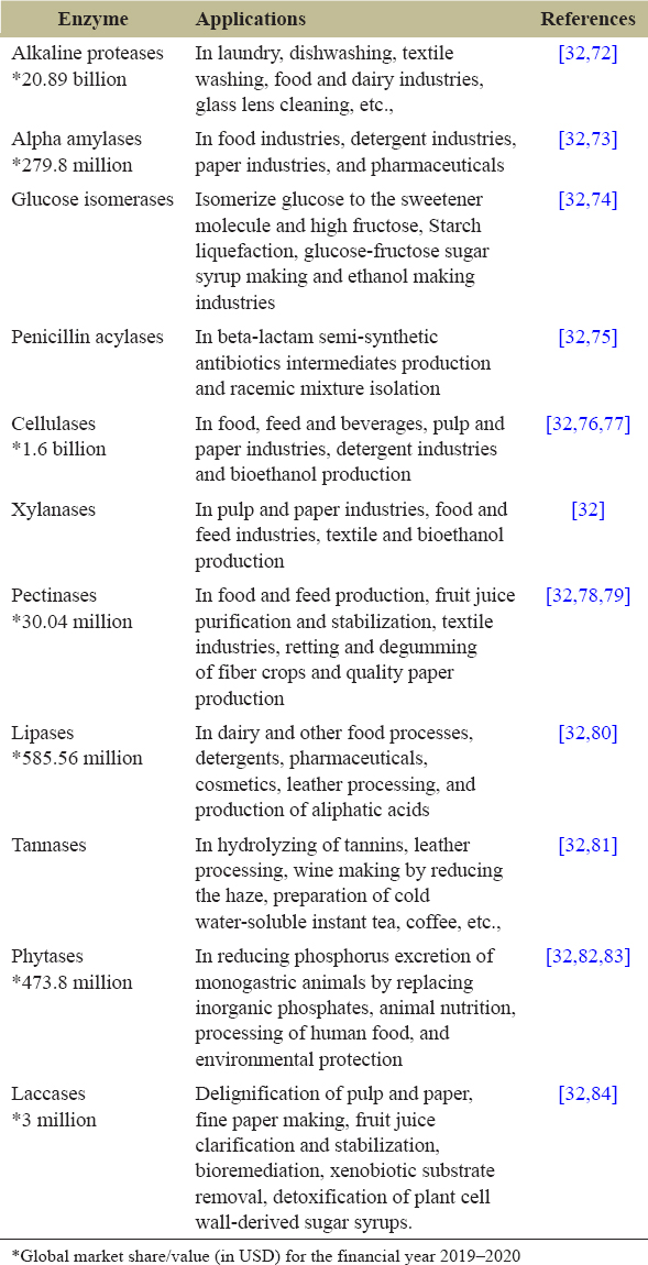 31. Sarrouh B, Santos TM, Miyoshi A, Dias R, Azevedo V. Up-to-date insight on industrial enzymes applications and global market. J Bioproces Biotech 2012;S4:002. [CrossRef]