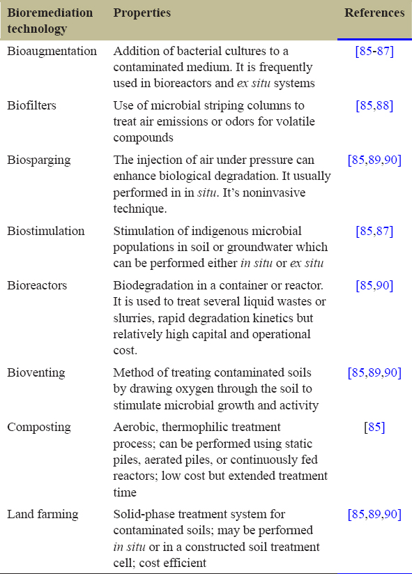 | Bioremediation technology | Properties | References |