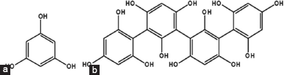 | Figure 1: Phloroglucinol. (a) The phloroglucinol units are bonded to one another by C-C or C-O-C bonds forming the oligomer called the tetrameric phlorotannin (b). [Click here to view] |