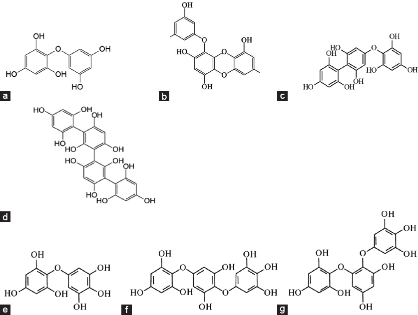 | Figure 2: Chemical structures of five different types of phlorotannins: (a) Diphlorethol, (b) Eckol, (c) Fucophlorethol-A, (d) Tetrafucol-A, (e) Bifuhalol, (f) Trifuhalol A, and (g) Trifuhalol B. [Click here to view] |