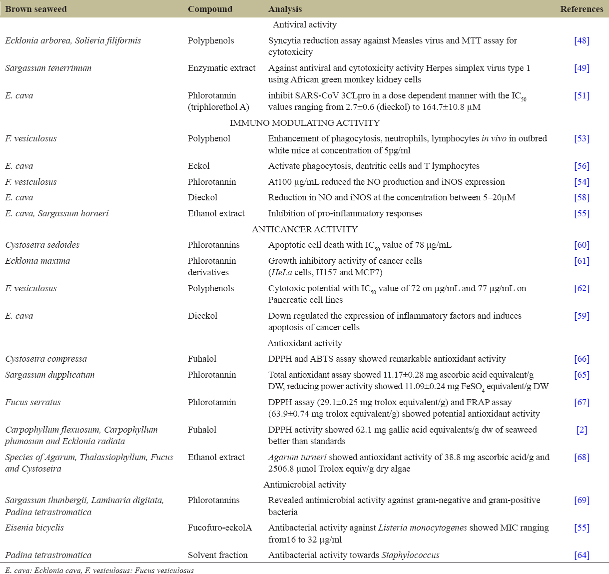 Phlorotannin from brown algal species was studied and reported for possessing numerous biological activities and is still under exploration. They have been studied to exhibit nutraceutical and health supplements for livestock. The biological activities reported include antioxidant, anticancer, anti-inflammatory, anti-diabetic, anti-viral, neuroprotective, radioprotective, anti-allergic, anti-microbial, and immune-modulating potential. The biological significance of various phlorotannin compounds was described by Chitikela et al. [39]. In this review article, various biological activities and recent finding of phlorotannin from brown algae are analyzed. The biological activities of phlorotannin compounds studies latterly are mentioned in Table 1.