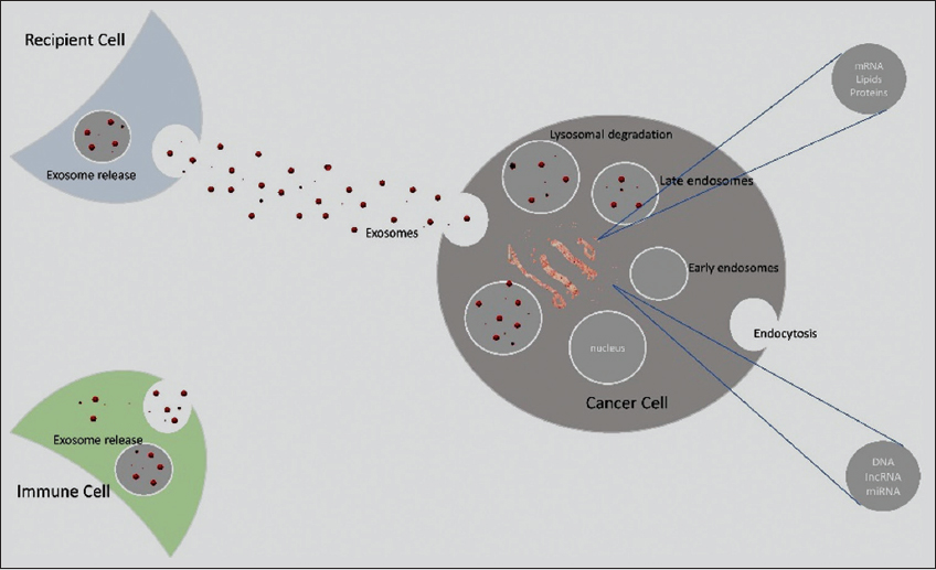 In the case of BC, exosomes mostly include proteins, enzymes, and nucleic acids. There are various forms of RNA (ribonucleic acid) in nucleic acids, including mi RNA, mRNA (messenger RNA), and tiny quantities of piwi RNA, including RNA, transfer RNA, and ribosomal RNA. GTPases (Guanosine triphosphatases) and annexin proteins, for example, are found in exosomes and interact with target cells. As previously stated, exosomes are involved in practically every phase of cancer prognosis. This encompasses both early cell proliferation and metastasis [Figure 3].