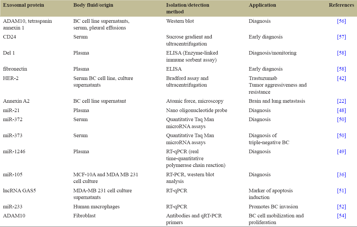 | Figure 5: Exosome and its cargo in breast cancer. [Click here to view] |
