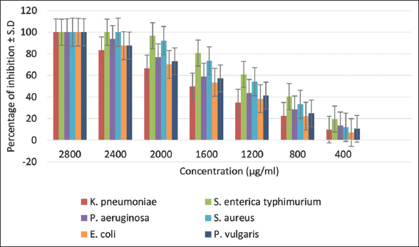 Inhibitory activity was observed in all the tested concentrations against all the pathogenic bacteria [Figure 7]. Among the different concentrations tested, the 2800 μg/ml has registered the complete growth inhibition percentage (100%) followed by 2400 μg/ml has shown the 83.4%, 100%, 93.67%, 100%, 87.5%, and 87.5% of inhibition against K. pneumoniae, S. enterica Typhimurium, P. aeruginosa, S. aureus, E. coli, and P. vulgaris, respectively. The least inhibition activity was observed in 400 μg/ml against all bacteria tested.