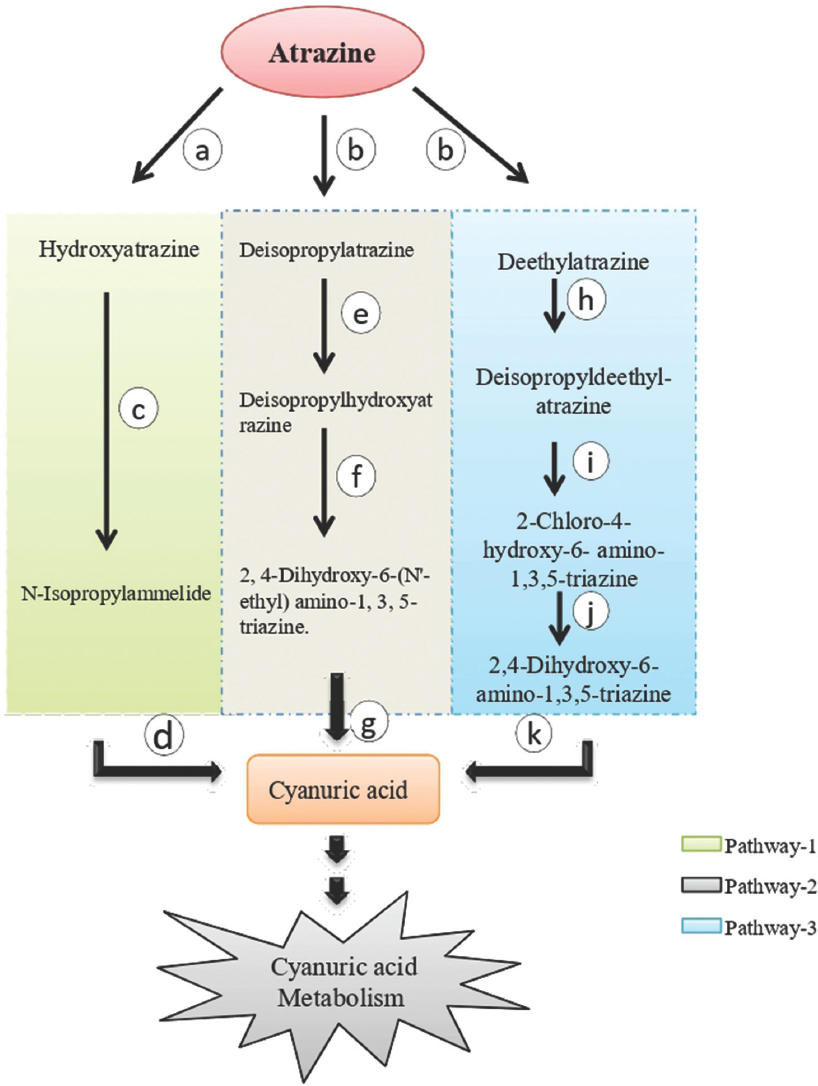 Degradation pathways of atrazine occur through three major different pathways that channel into cyanuric acid metabolism [1]. The degradation pathway is generally initiated by two enzymes, that is, atrazine chlorohydrolase and atrazine monooxygenase. The first pathway is initiated by the enzyme atrazine chlorohydrolase catalyzes the hydrolytic dechlorination of atrazine and produces hydroxyatrazine (HA) which is further converted into N-Isopropylammelide by the activity of atrazine ethylaminohydrolase and finally into Cyanuric acid later on by N-isopropylammelide isopropylaminohydrolase [17].