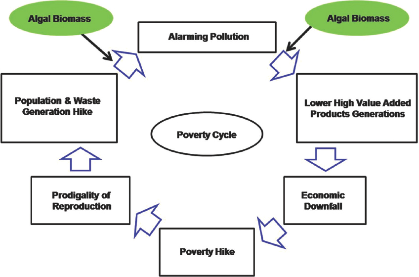| Figure 1: Poverty cycle encourages improvement on algae biomass production. (Lower biomass productivity and Lower waste bioremediation can be executed through the involvement of algal biomass generation). [Click here to view] |