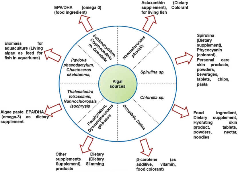 Both microalgae and microalga are potential feedstock for production of different value added products (e.g., proteins, vitamins, minerals, fats, sugars, antioxidants, cosmetics, bio-pharmaceuticals, bioactive nutraceuticals, natural dyes, and colors in addition to animal feeds) to utilize their biomass. To balance the total biocatalytic efficacies from photon toward value added products, algae that are not only have the optimal carbon sequestration but also assimilate the extensive amounts of protein, carbohydrate, and fat contents. Algae have been widely used as a high-dietary supplement in human nutrition, aquaculture, nutraceuticals, fuel, and various purposes.