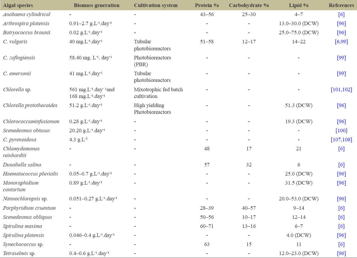 | Algal species | Biomass generation | Cultivation system | Protein % | Carbohydrate % | Lipid % | References |